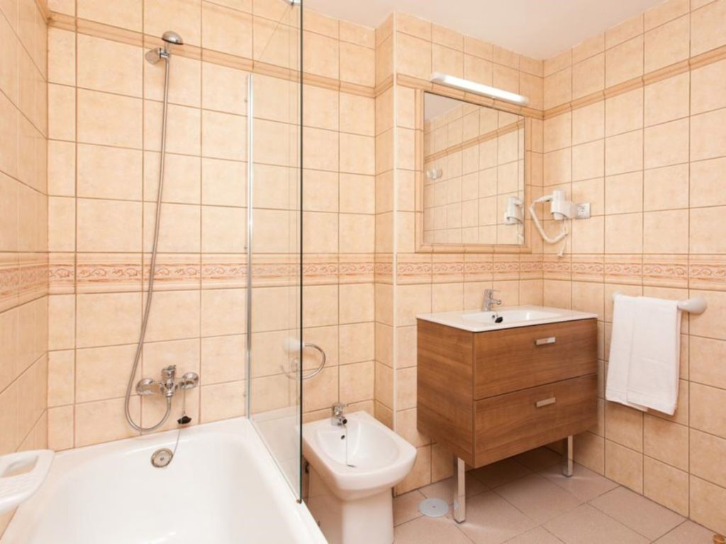 Nuestros apartamentos te acogerán en sus amplias estancias con un ambiente fresco, íntimo y tranquilo gracias a los tonos ocres de la decoración en madera, neutros y agradables. El dormitorio principal dispone de dos camas individuales con colchones de excelente calidad para garantizar su descanso, un armario amplio perfecto para familias o largas estancias, y un caja fuerte de alquiler, entre otros. El baño es espacioso y está dotado de un gran tocador, una mampara de cristal con ducha y bidet, secador de pelo y espejo de aumento.